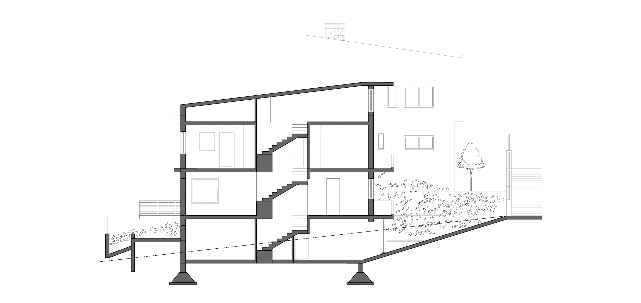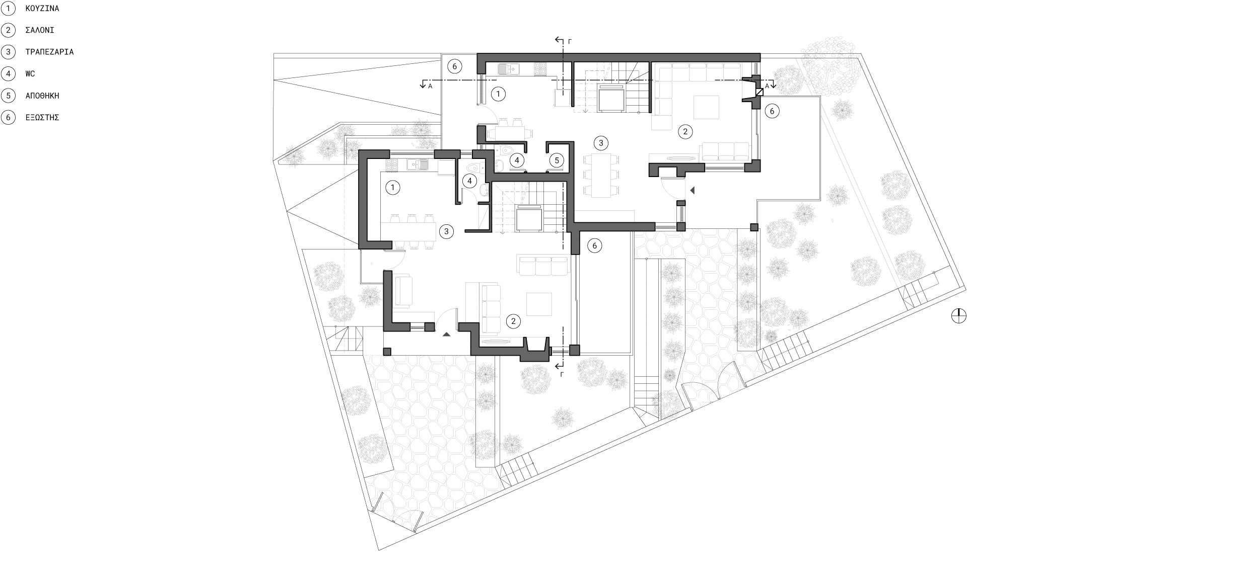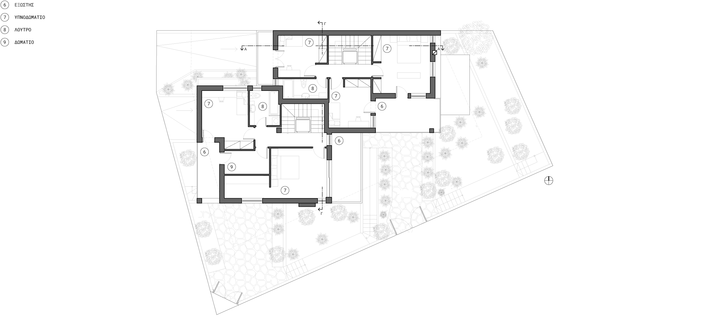Τον σχεδιαστικό άξονα καθορίζουν τα κύρια χαρακτηριστικά του οικοπέδου: το ιδιαίτερο γεωμορφολογικό υπόβαθρο, ο προσανατολισμός και η θέα. Το οικόπεδο είναι γωνιακό, με έντονη κλίση προς δύο διευθύνσεις, έχει κύριο προσανατολισμό Βορρά-Νότου και εξαιρετική θέα προς το απέναντι βουνό.